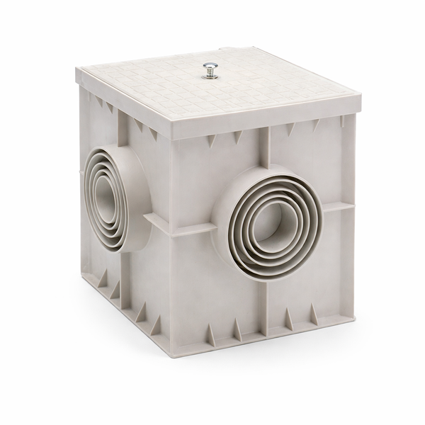 * Caixa em polipropileno (PP) de elevada resistência, equipada com tampa superior robusta, ideal para sistemas de drenagem e esgoto, garantindo durabilidade e fácil acesso para manutenção.