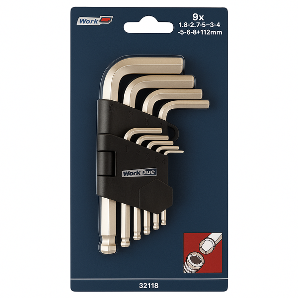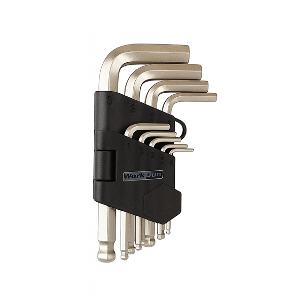 *Conjunto de 9 chaves sextavadas tipo L com ponta esférica, organizadas em suporte compacto, ideal para apertos de precisão em várias medidas.