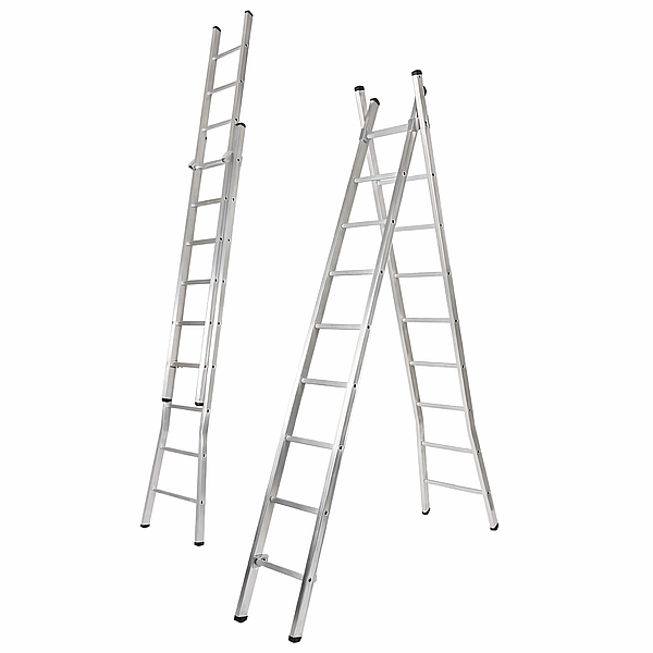 * Escada dupla em alumínio com degraus redondos, leve e resistente, indicada para uso doméstico e profissional.
