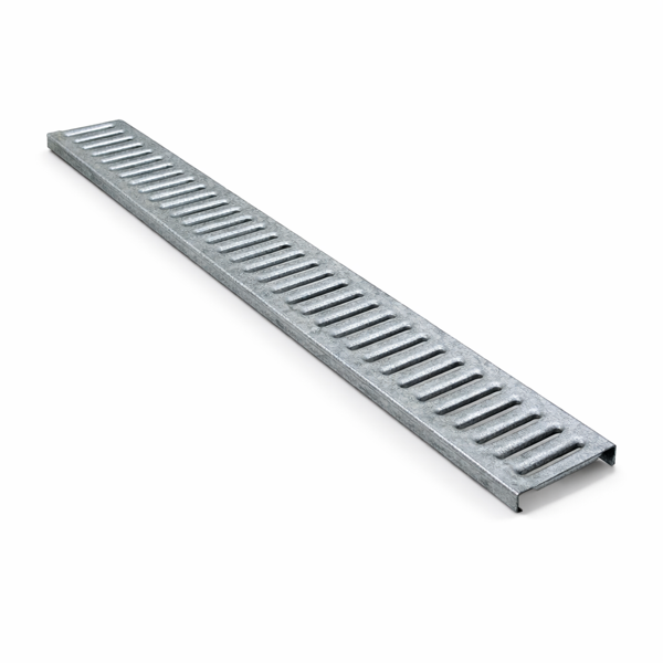 * Grelha metálica fabricada em aço galvanizado, concebida para instalação em canais de drenagem Wave, permitindo o escoamento eficiente de águas pluviais e evitando a entrada de detritos no sistema de drenagem.