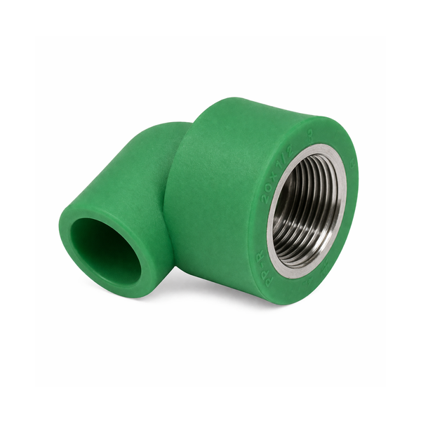 * Conexão em PPR (Polipropileno Copolímero Random) com inserto metálico fêmea, ideal para mudanças de direção em sistemas hidráulicos, garantindo resistência, vedação segura e longa durabilidade.