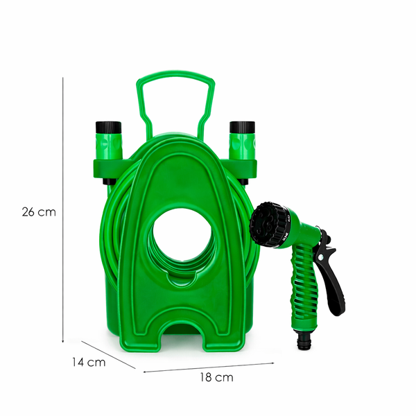 * Mangueira de 10 metros com suporte compacto e chuveiro de 7 funções, ideal para rega de jardins, varandas e pequenos espaços exteriores.