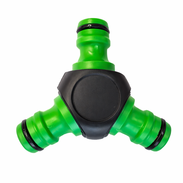 * União plástica de 3 vias para ligação simultânea de mangueiras, permitindo a derivação do fluxo de água.