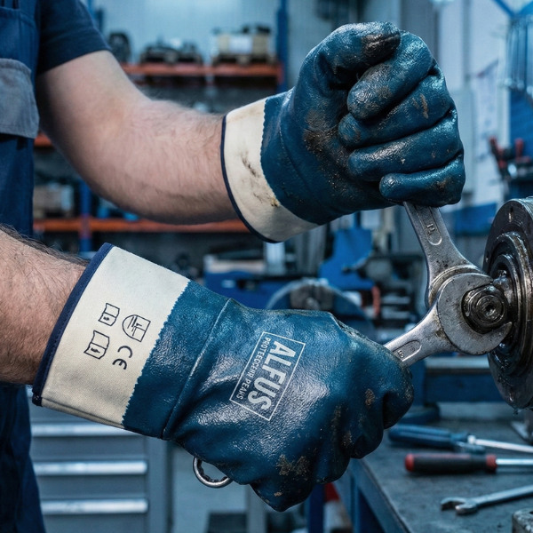 * Luvas em malha com revestimento de uma camada de nitrilo.