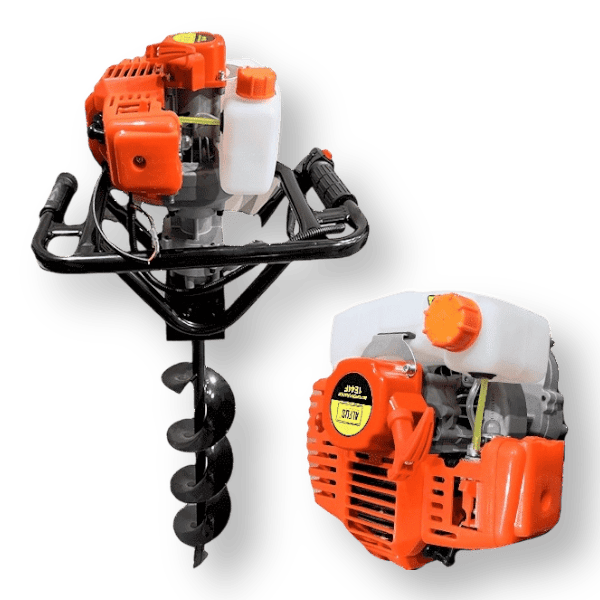 * Esta máquina é um berbequim de grandes dimensões impulsionado por um motor a 2 tempos que faz buracos no solo com facilidade, gerando buracos quase perfeitos