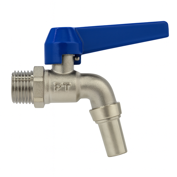* Torneira de esfera metálica com bico de saída, indicada para depósitos e recipientes de vinho.